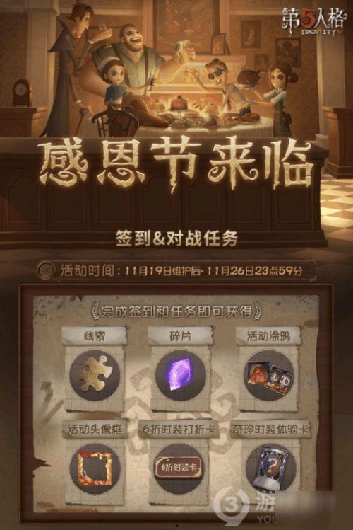 感恩节期间,第五人格将举办一系列活动,让玩家们尽情享受这个特别的节日。比如,玩家可以通过完成任务获得限定皮肤,还有机会抽取稀有道具。此外,官方还会举办线上比赛,让玩家们展示自己的实力。